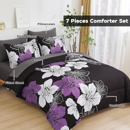 Luxudecor Floral Comforter Set King Size, 7 Pieces Bed in a Bag Purple Floral Comforter and Sheet Set, Soft Microfiber Complete Bedding Sets for All Seasons