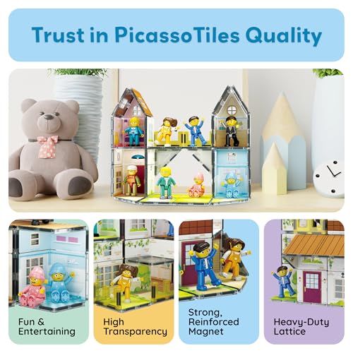 PicassoTiles Magnet Tile Building Block Family Homestead Doll House Theme Playset 8 Character Action Figures Double Sided Magnetic Tiles Printing STEM Education Learning Kit Toy Set Kids Ages 3+ PTQ06