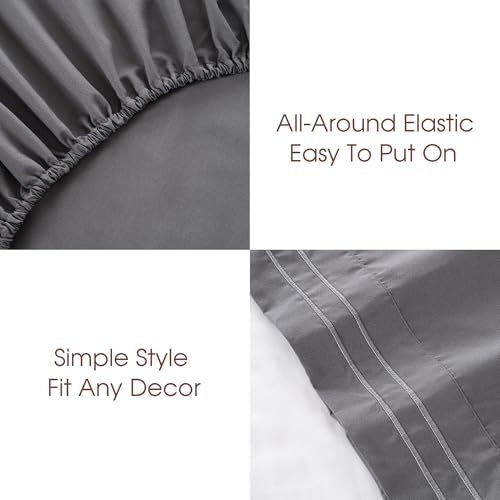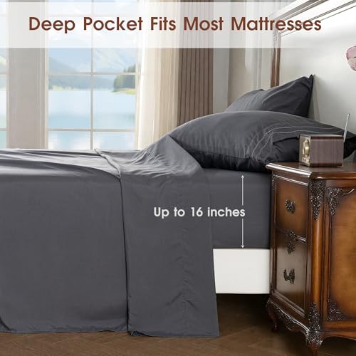 Ranunculus 4 Pieces Queen Bed Sheets, Soft Fitted Sheet Queen Size & Bedsheet & 2 Pillowcases, Washed Brushed Microfiber - Deep Pocket, Breathable, Fade Resistant,Easy Care (Dark Grey,Queen)