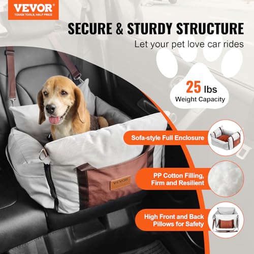VEVOR Dog Car Seat, Waterproof Dog Booster Seat for Car with Side Handles and A Storage Pocket, Clip-On Safety Leash and PP Cotton Filling, Dog Car Bed for Small Dog up to 25lbs, Gray