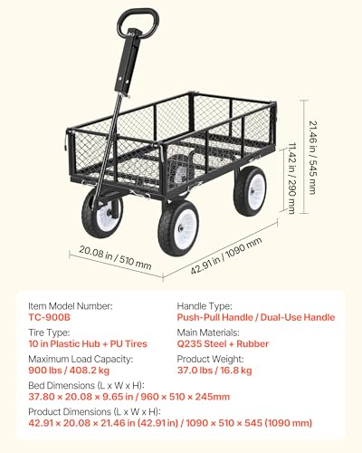 VEVOR Garden Cart, 900 LBS, Heavy Duty Steel Yard and Garden Utility Wagon with 10-Inch Tires, Outdoor Gardening Stool with Adjustable Handle, Detachable Side Panels, Attach to ATV or Tractor, Black