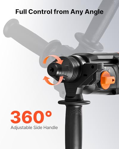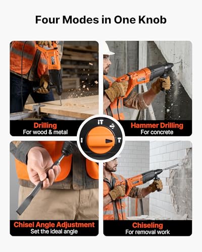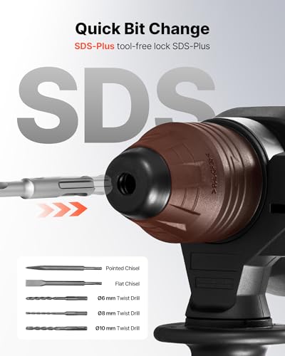 VEVOR Rotary Hammer Drill, 1-1/8 in SDS-Plus Electric Corded Heavy Duty Rotary Hammer, 4 Functions, Including 3 Drill Bits, Flat Chisel, Pointed Chisel, and Carrying Case, for Concrete and Masonry